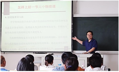 第二场讲座,李老师针对应聘课和普通授课应该注意的事项进行了详细地讲解,分别从备课,引课,授课,以及习题课几个方面进行讲述。其次李老师把高中物理的课型进行了分类,有概念型的课,推理型的课,实验型的课等。使得我们在应聘时,可以根据不同的课型有针对地进行教学设计。老师还为我们展示了,他所设计的应聘课的备课步骤,让我们清晰地感受到了在进行备课时的整体框架,为我们理清了思路。最后老师,传授了几个有用的应聘技巧。对于不经常上课的我们来说,对时间的把握还是有困难的,可以在右手上带一个手表,当我们在黑板写字时,就可以顺便看到时间。在进行面试时,可以带一张白纸,用于准备时构建整体的教学框架,设计教学过程。也可以再带一些小的物件,比如说轻绳,钥匙链,小物块等。这些小物件可以用于授课过程中的需要。比如讲圆周运动,就可以利用细绳和钥匙链演示圆周运动。比如计算结果比较复杂时,可以事先将计算好的答案写到手上,这样可以避免计算花费太多时间。