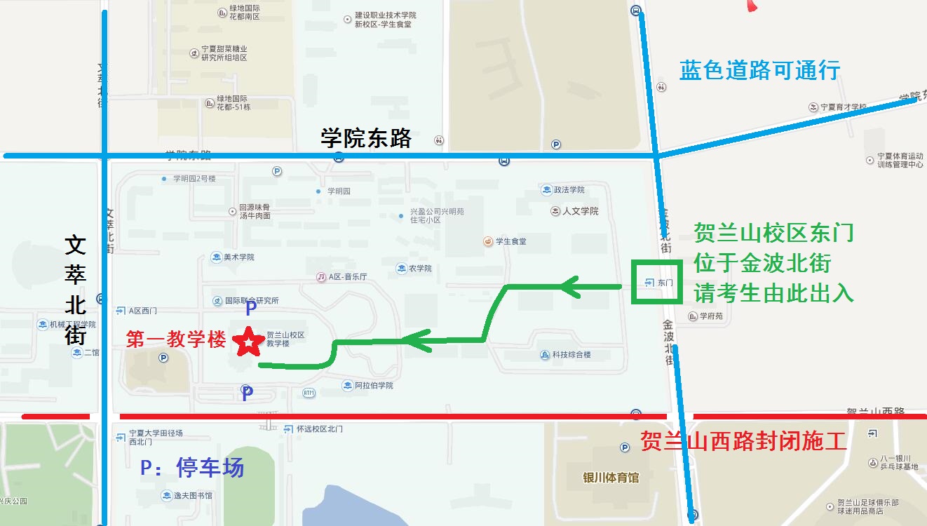 根据银川市市政道路规划,贺兰山西路近期正在实行道路全封闭施工改造。目前,我校贺兰山校区南门无法通行。请3月10日参加红宝石网址线路检测中心2018年博士研究生入学考试的考生及车辆全部由贺兰山校区东门进出。路线如下图所示:
